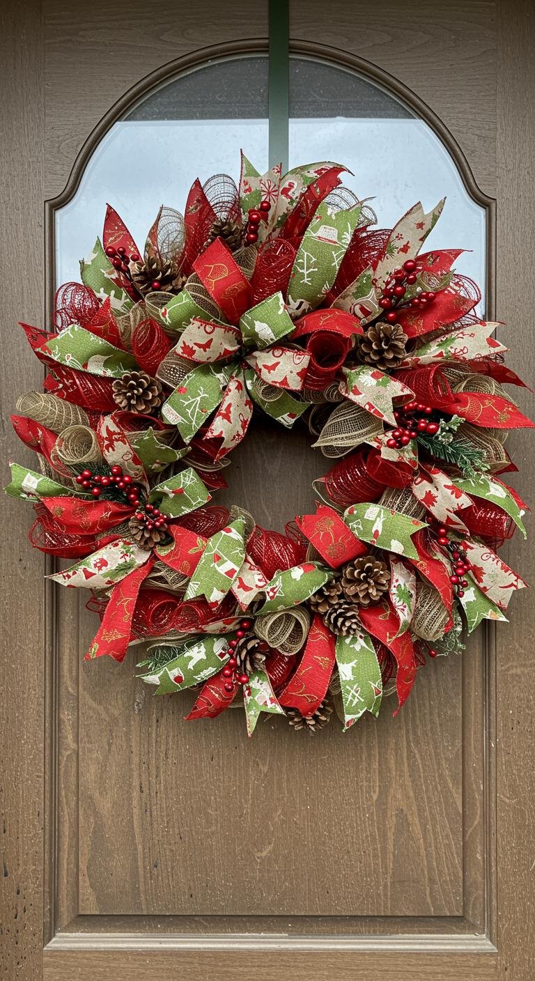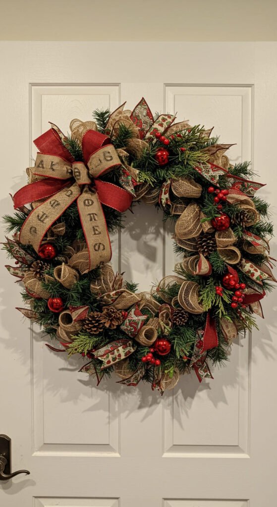 You can twist and layer ribbons or add wreath embellishments like pinecones and berries. It’s a simple DIY project that brings joyful warmth to your space—perfect for welcoming friends and family during the season!