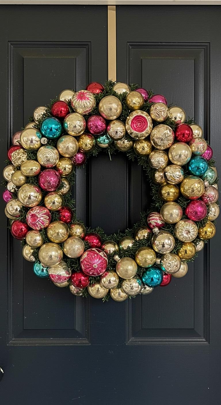A vintage Christmas ornament wreath brings a nostalgic touch to your holiday décor, making it a delightful centerpiece for your front door or inside your home.