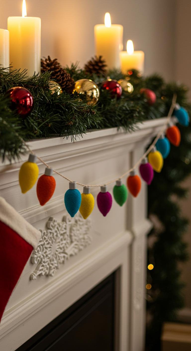 Bring the cozy glow of holiday lights to spots that don’t have actual bulbs by crafting felt holiday lights. Cut out bulb shapes from a rainbow of felt, then stitch or glue them onto a long ribbon. This colorful garland is perfect to drape around your tree, mantle, or window frames — it’s easy on the budget and a cheerful project that feels like you’ve wrapped your home in a hug.