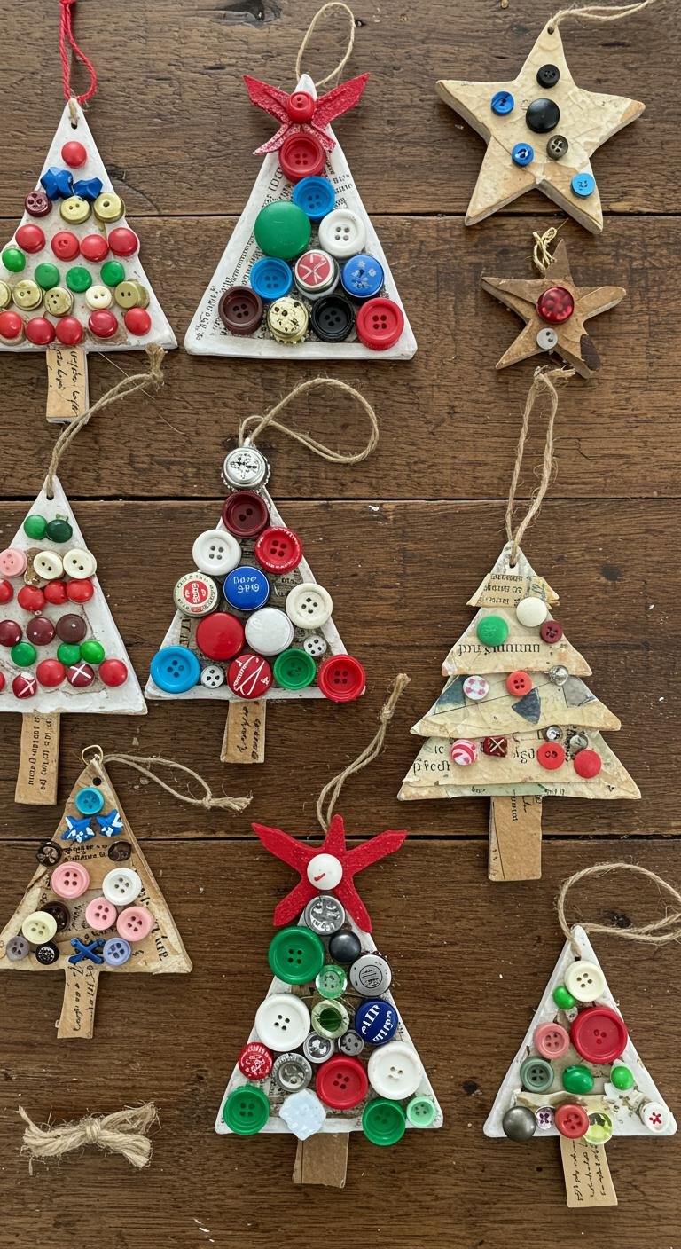 Upcycling holiday decor? Yes, please! Gather buttons, bits of old jewelry, scrap paper — basically whatever’s hanging around — and glue, stitch, or string them into unique ornament shapes. This is a super cool way to keep your crafts sustainable and budget-friendly, while creating one-of-a-kind decorations that tell a story and add an extra touch of meaning to your holidays.