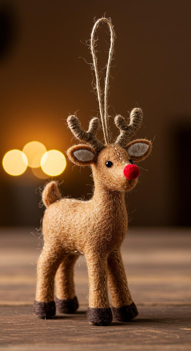 Want to add a bit of rustic charm? Felt reindeer are where it’s at. Use brown felt to cut out the main reindeer shape, plus little pieces for antlers and a bright red nose. Layer them for some depth and glue everything in place. For the finishing touch, add some embroidery thread along the edges to give it a handmade feel. Hang ’em on your tree, gift ’em to loved ones, or keep ’em all for yourself because they’re seriously cute and crafted with minimal fuss.