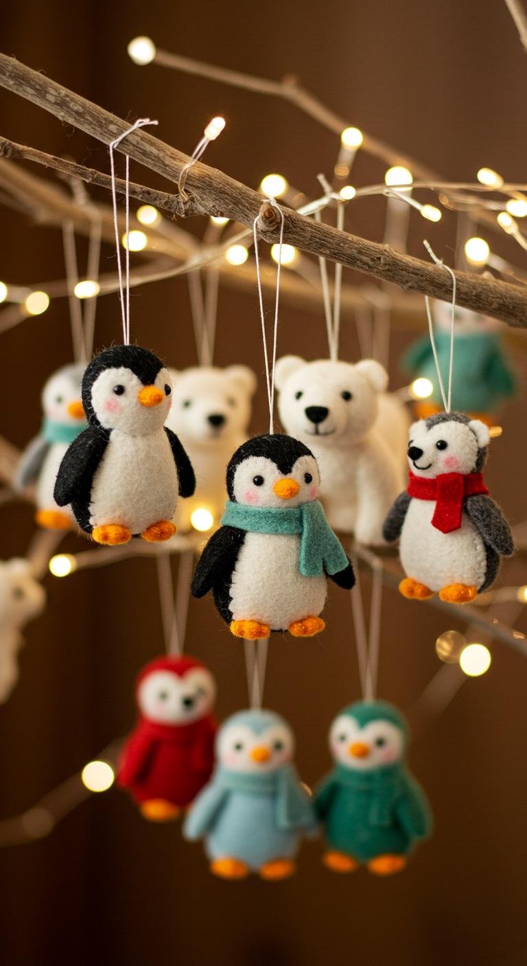 Animal lovers, this one’s for you. Felt animal ornaments like penguins and polar bears bring a whimsical, playful vibe to your holiday decor. Cut out the body, eyes, and little features from your felt stash, then glue them together to create adorable critters. Kids especially love this one, and these little buddies make your tree feel cozy and alive, or you can gift them to friends who appreciate that handmade touch.