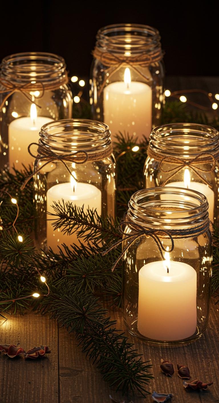 Mason jars are basically the superheroes of DIY decor. Grab a few, plop in tea lights or little candles, and surround them with pinecones, dried fruit, or fresh greenery. Want to add some sparkle? A little glitter or faux snow works wonders. Wrapping twine or lace around the top gives these holders an extra cozy touch. They’re perfect for lighting up your holiday table or mantel, creating that soft warm glow that makes everything feel just right — and they won’t break the bank.
