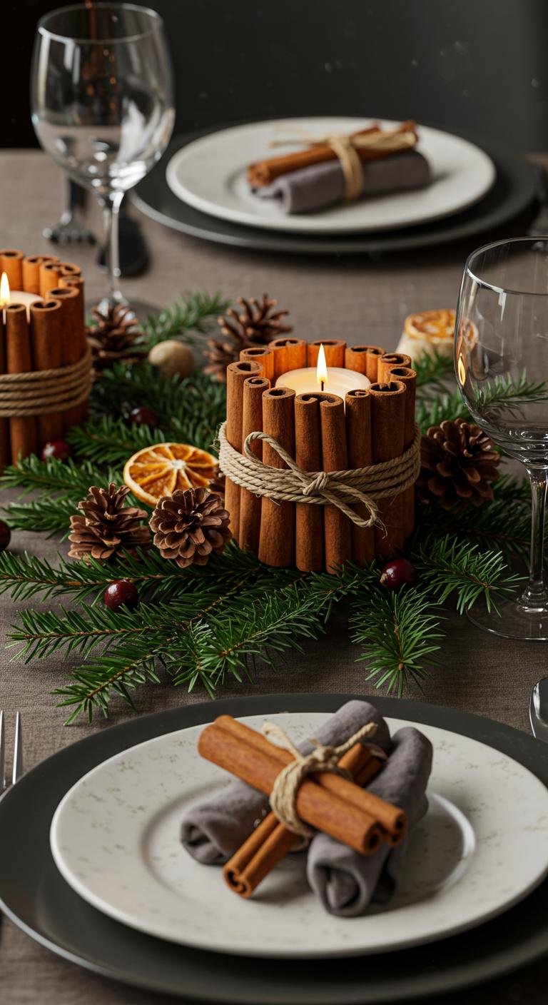 A simple bundle of cinnamon sticks tied with twine makes such a charming centerpiece. Place it smack dab in the middle of your table and surround it with some greens and little ornaments to elevate the look. Bonus: it fills the room with that classic warm cinnamon scent that’s basically Christmas in a smell. It’s an easy, budget-friendly way to impress guests without trying too hard.
