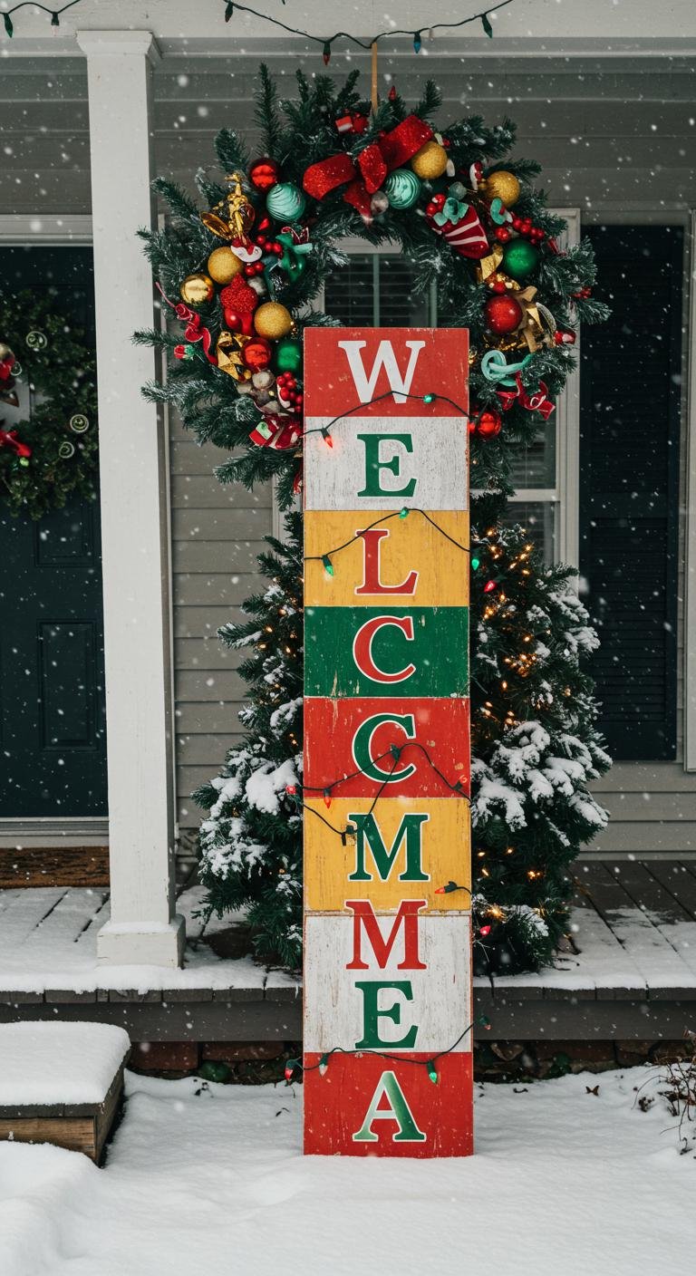 Whip up a big, bold sign for your porch to welcome guests in style. Use sturdy plywood as your base and paint on cheerful seasonal greetings. Amp it up with some string lights to make sure it’s eye-catching even after dark. You can place it right on your porch or near your entrance, and using scrap wood or clearance materials can keep it affordable and eco-friendly.