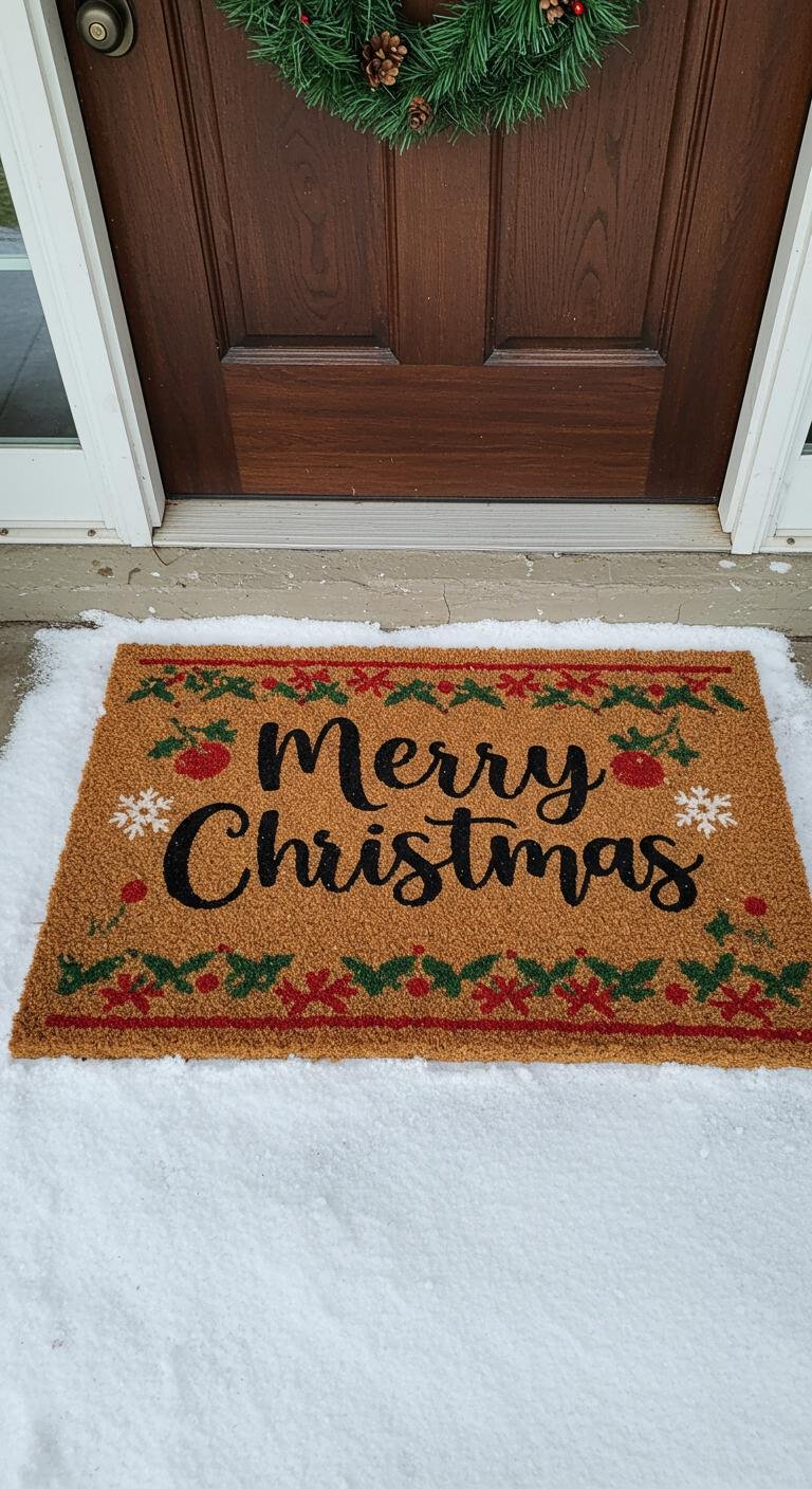 Sometimes it’s the little details that make the biggest impact. A cheerful seasonal doormat with holiday greetings or cute designs instantly brightens up your porch entrance. Make sure to pick a durable one so it holds up through winter weather — it’s a small touch that sets a festive mood before anyone even steps inside.