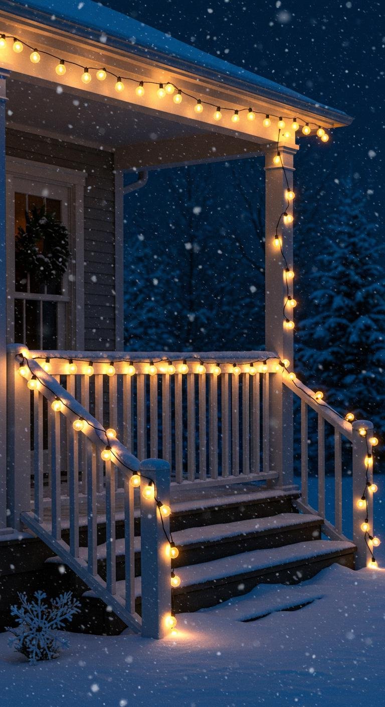 String up some twinkling LED lights around your railings, windows, or door frames to add that magical glow as evening falls. Whether you go for warm whites to keep it cozy or colorful strands to amp up the fun, securing them well with clips or tape makes sure your decorations stay put all season long. It’s a fast way to turn your porch into a holiday wonderland.