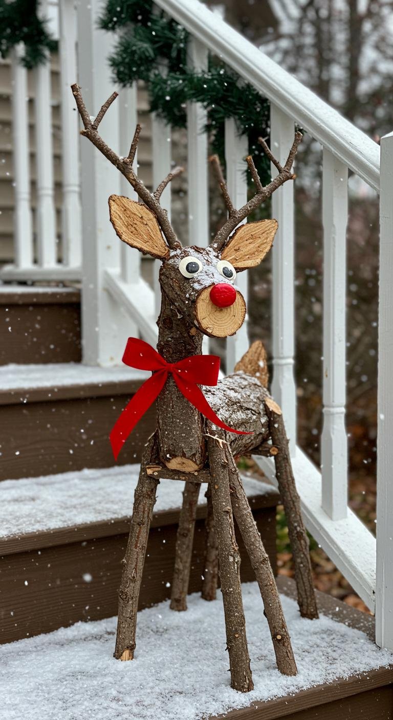 Want to add a playful, rustic touch? Try making log reindeer using all-natural materials. Just stack logs of different sizes to form the body, use branches for adorable antlers, and grab some small rocks for eyes. Feel free to paint on some character stripes or throw on a scarf for extra personality. These guys make great porch pals, especially when placed near your steps welcoming guests with that cozy holiday feel.