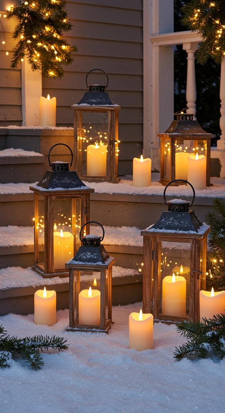 Lanterns bring such a warm, welcoming glow and they’re super easy to style. Grab some rustic or vintage-style lanterns and fill them with flameless candles for a safe, lovely look. Cluster a few by your steps or line them up for extra charm. Toss in some pinecones or little ornaments inside the lanterns to jazz them up. This quick setup adds instant holiday cozy vibes and can be put together in an evening — promise!