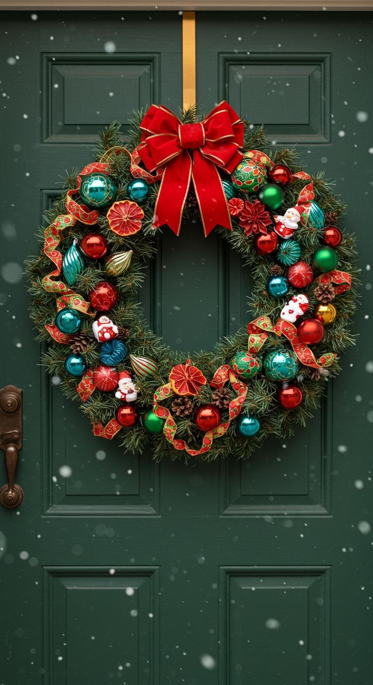 Nothing beats a vibrant wreath on your front door to set the holiday tone. Use a foam or wire base and get creative with ornaments, ribbons, greenery, and whatever bright colors make you happy — whether that’s playful multicolor or classic reds and greens. You could even upcycle an old wreath base to keep it budget-friendly. It’s an easy way to bring a personal touch right at the doorstep.