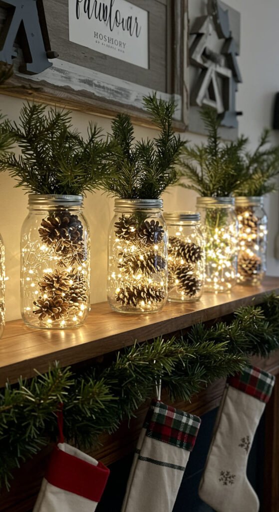 A cozy farmhouse setting featuring a rustic wooden mantle adorned with mason jar displays. Each jar is creatively filled with pinecones, twinkling fairy lights, and fresh evergreen sprigs. The jars are arranged artfully among seasonal decor, setting a warm, inviting atmosphere for holiday festivities. The surrounding decor complements the rustic elegance, enhancing the charm of the space.