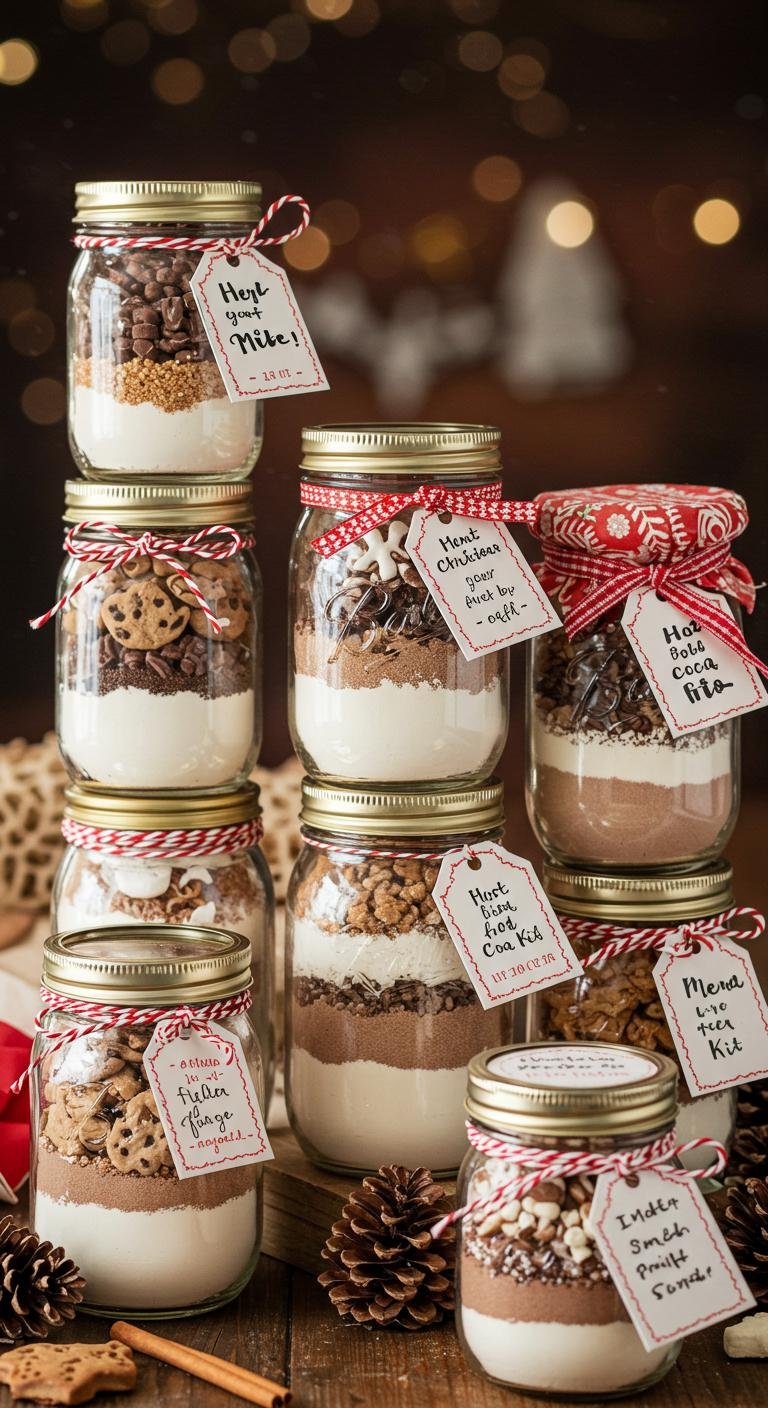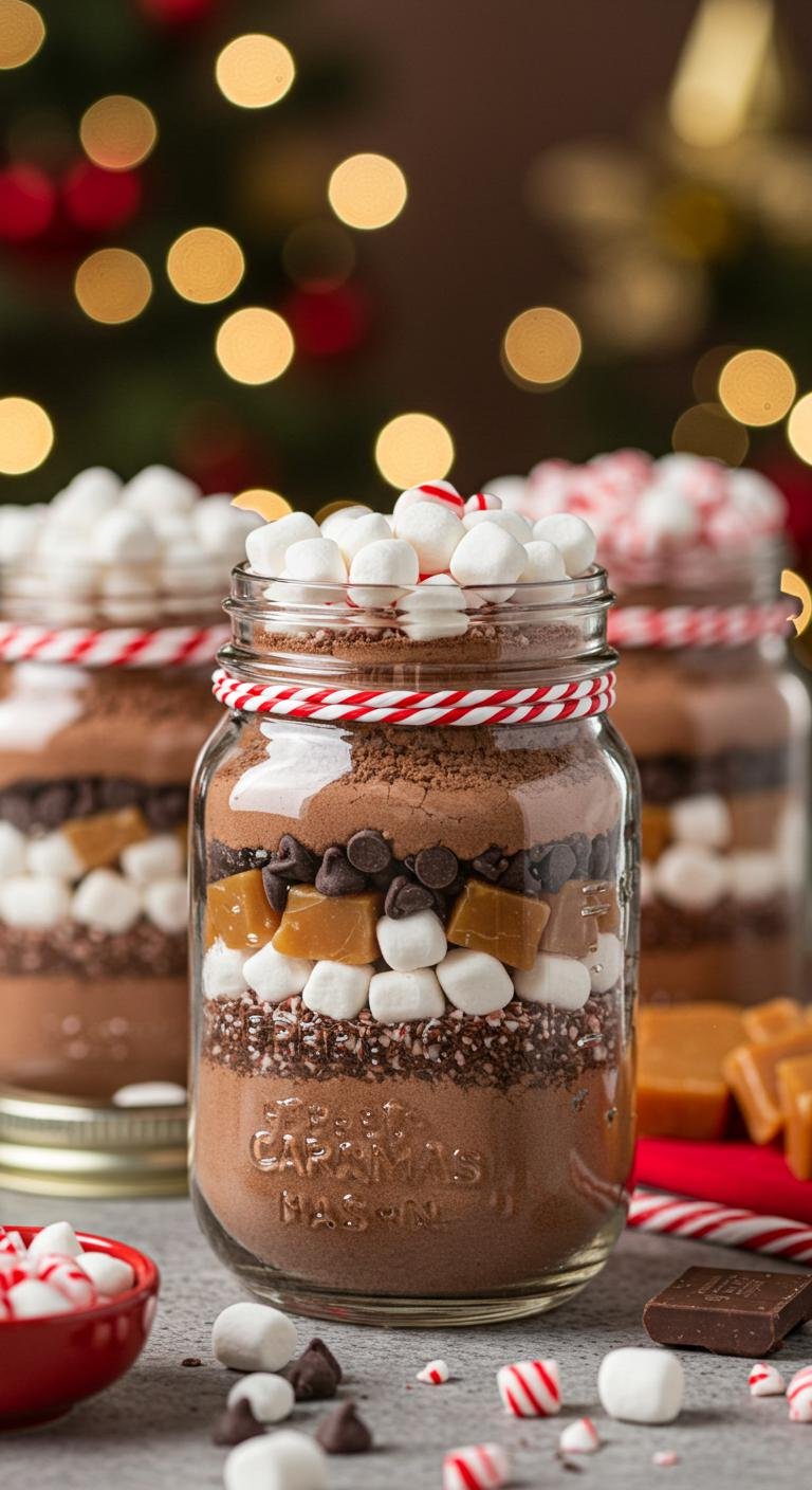 Choose your favorite hot cocoa flavors, like classic, peppermint, or salted caramel, and layer them in a mason jar.