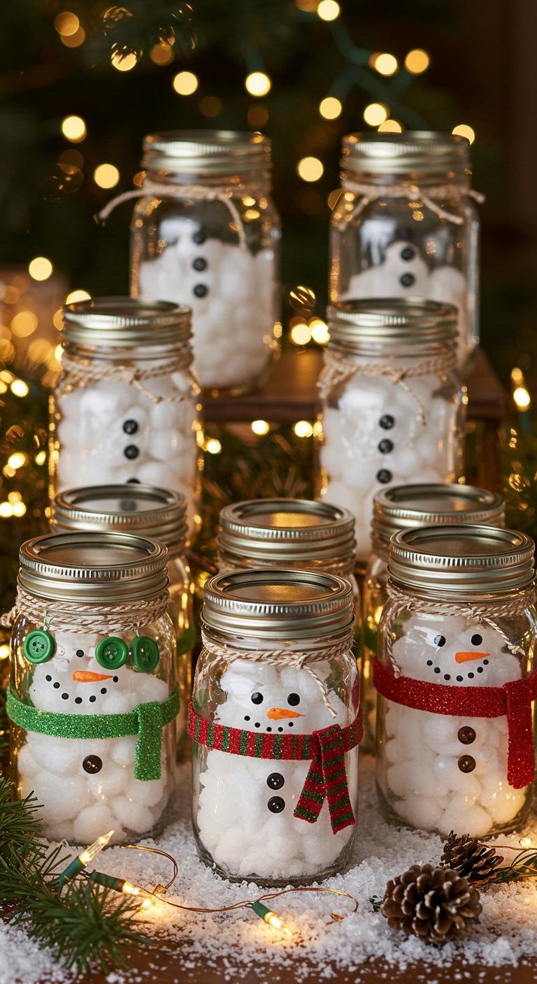 If you want to bring some whimsical charm to your holiday décor, crafting mason jar snowmen is a fun and creative project. Start with clear mason jars and add snowman accessories like buttons and scarves. Fill each jar with faux snow or cotton balls for a frosty look. These adorable winter decorations will definitely add joy and cheer to your festive atmosphere!