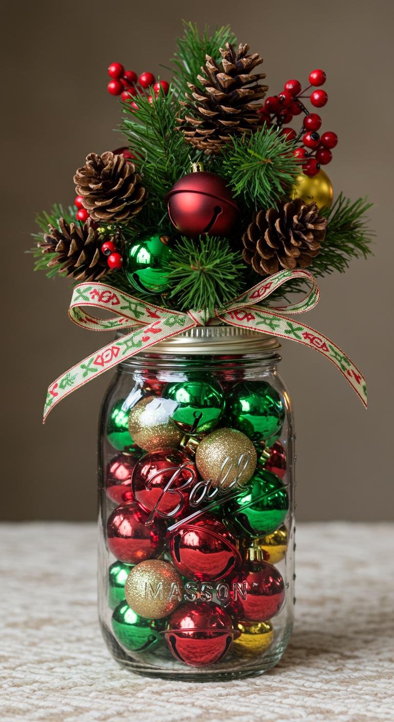 Create delightful mason jar arrangements filled with ornaments, pinecones, or candles to capture the magic of Christmas.