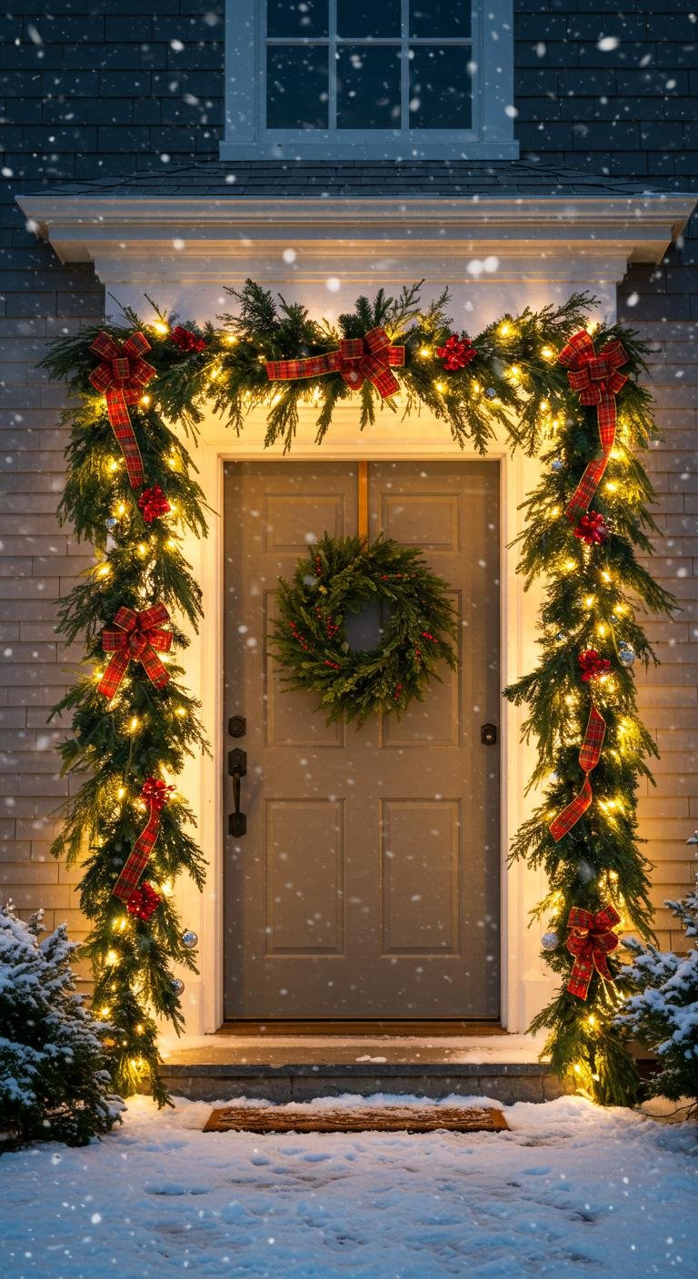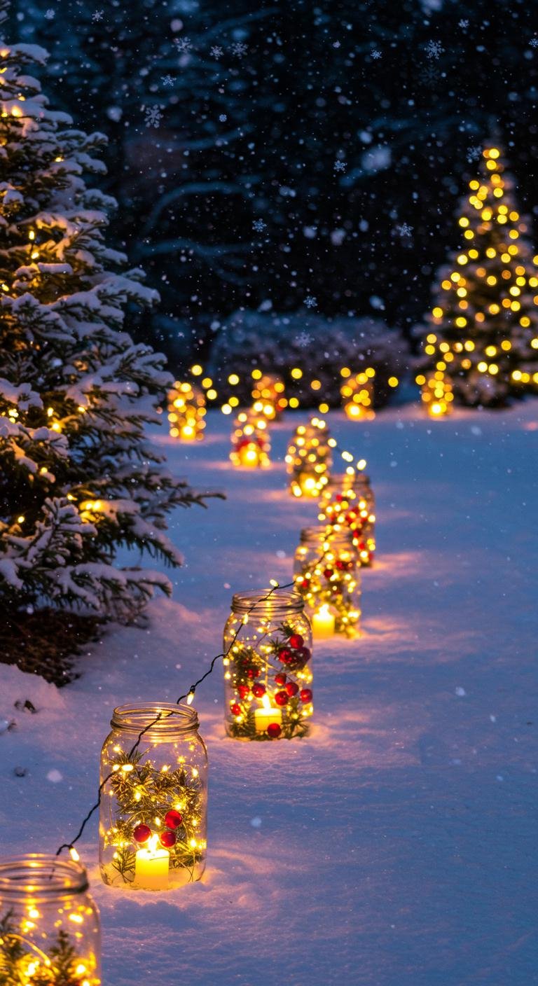 Imagine your guests’ smiles as they’re guided to your home by a glowing pathway! You can fill mason jars with Epsom salts to mimic snow and place LED tea lights inside for that perfect cozy light. Lining them up along your driveway or path is a quick and budget-friendly way to add sparkle. Another cute idea is wrapping small trees or bushes with fairy lights — the twinkle effect is so magical! Most of these materials cost less than $30, and you can set it all up in just an afternoon.