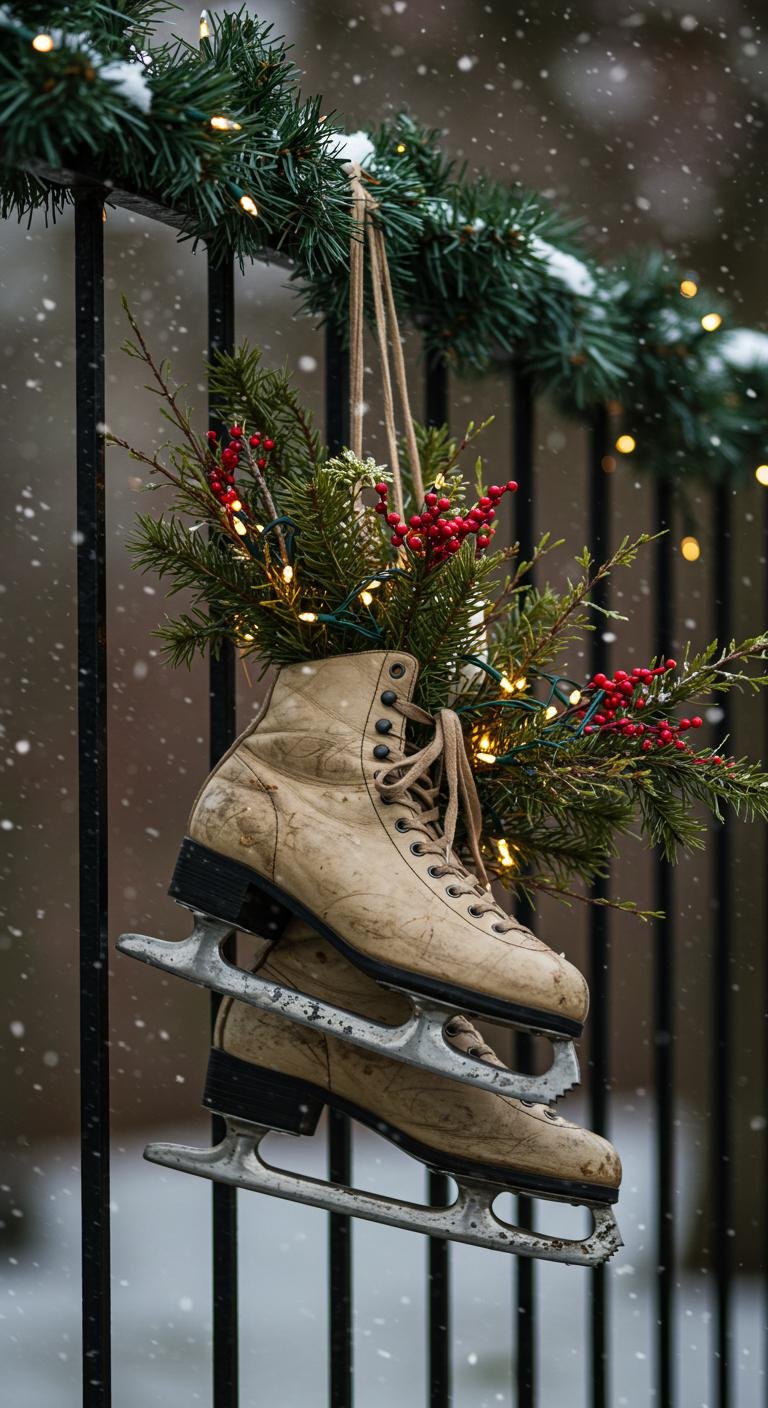 Finding vintage ice skates at thrift stores and turning them into yard decor? Yes, please! Fill them with pine branches and colorful ornaments for an extra festive touch. Hang them by your front door or attach them to fences. This little nod to winter pastimes is charming and usually costs less than $15. It’s one of those unique decor ideas that feels like a warm holiday hug.