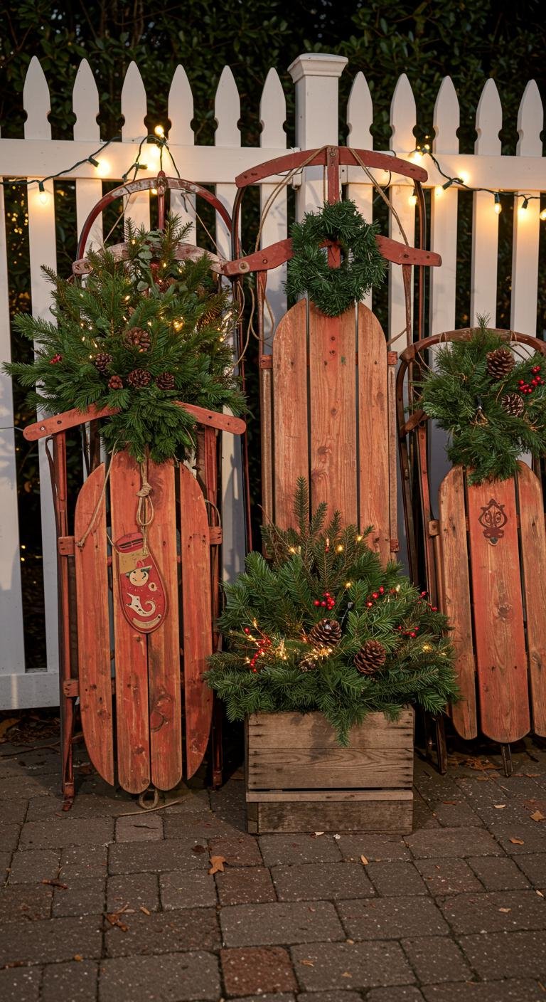 Vintage sleds are perfect for cheerful displays in your yard. Arrange them to hold plants, holiday gift baskets, or decorate them with greens, bright ornaments, and candles. It’s super nostalgic and adds playful winter vibes. You can usually snag these sleds at yard sales or thrift shops for under $30, making it an affordable and fun way to celebrate the season outdoors.