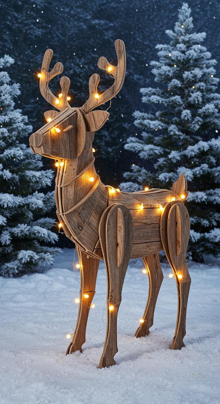 Adding wooden reindeer to your yard is an instant way to boost the holiday spirit. Start with logs or wooden planks, then cut out simple shapes for the body, legs, and antlers. A cut-and-dry style really works best here, and you can glue or nail the pieces together. Whether you go for a natural finish or paint on some festive accents, it’s sure to look charming. Don’t forget to wrap some lights around your reindeer at night — it gives such a warm glow! Overall, this project tends to run between $40 and $60 but is totally worth the cozy vibes it brings.