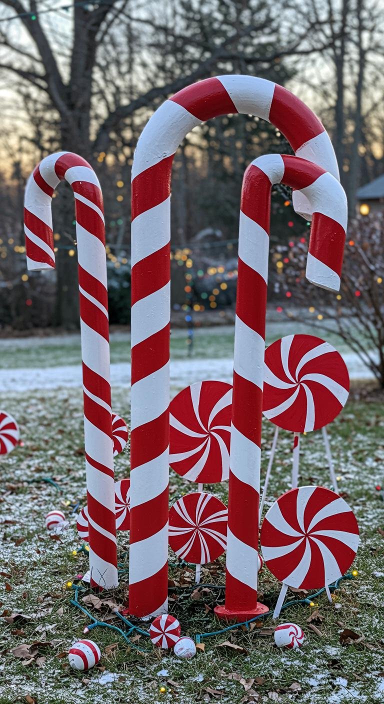 I love how playful candy cane decorations are, and making your own is easier than you’d think. Grab some PVC pipes, bend them into that classic candy cane shape, and paint them with festive red and white stripes. Alternatively, you can cut peppermint shapes out of plywood and paint them in fun colors. Placing these around your front yard or along walkways adds a cheerful and sweet vibe. This whole thing usually costs around $25 — a small price for such a big smile!
