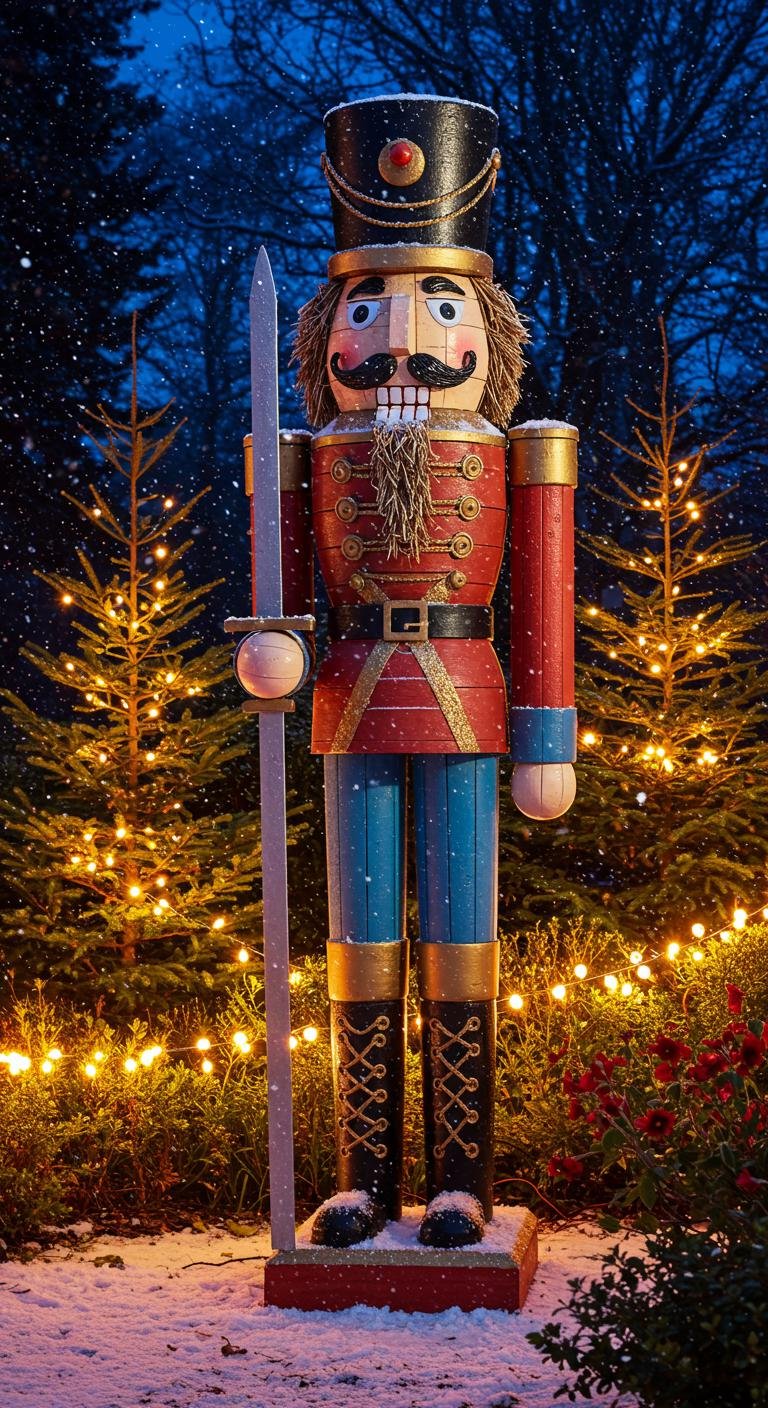 There’s something classic and stately about nutcrackers, right? You can bring that charm outdoors by crafting your own from recycled wood. Cut parts for the body, arms, and legs, then paint them with traditional festive colors. Don’t forget to add little details like a painted sword to complete the look. This bold decoration can steal the spotlight in your yard and can usually be made for around $50.