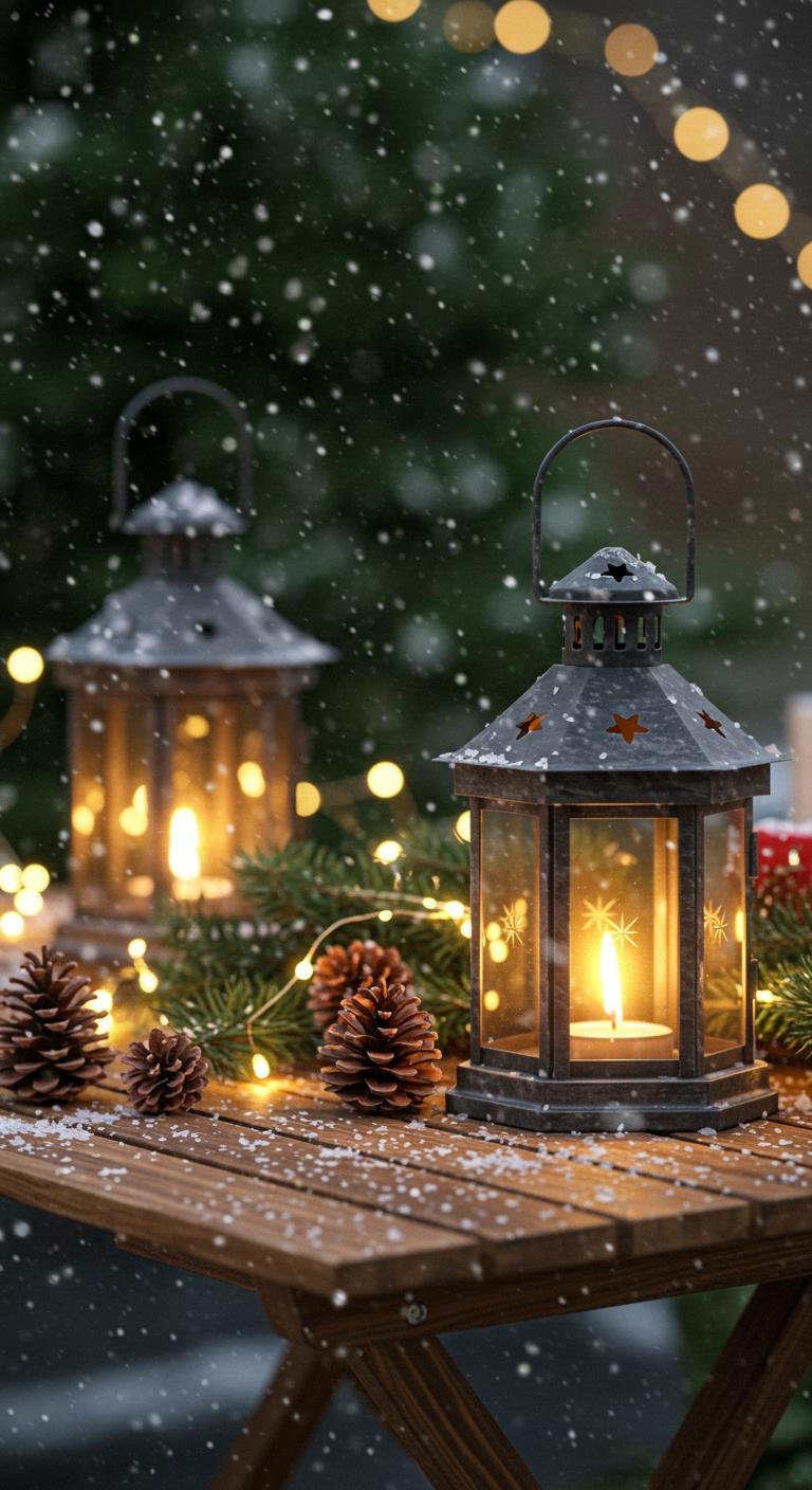 Lanterns instantly add coziness to any outdoor setting. Use mason jars, old lanterns, or even tin cans filled with fairy lights or candles. Surround them with natural accents like pinecones, berries, and sprigs of greenery to really get that holiday vibe going. Scatter these along your walkways or place them on outdoor tables to offer a warm, inviting glow. You can customize these as much as you want, and they’re usually super budget-friendly — think less than $20.