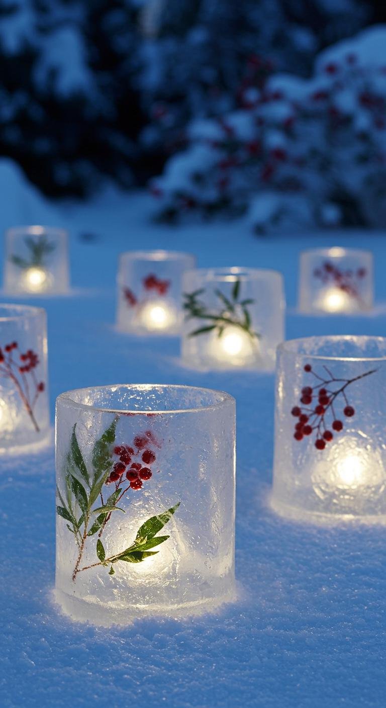 Ice lanterns are like little frosty gems scattered across your yard. Just fill a container with water and toss in pretty berries or leaves, then freeze overnight. Once solid, gently pop out the ice and place a tea light inside for a soft, glowing effect. They’re super whimsical, enchant the cold outdoors, and cost about $10 each to make. Line them up along your porch or pathways for that perfect winter glow.