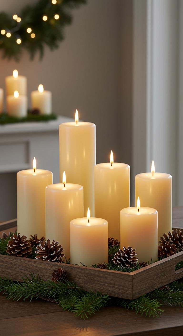 Candles grouped in different heights instantly cozy up any room. Arrange a bunch on a tray and surround them with pinecones and bits of greenery for a festive look that’s simple but stunning. Light ’em up when the evenings roll in and get ready for all the warm, fuzzy feelings. And don’t forget—using candles you already have makes it even sweeter on the wallet.