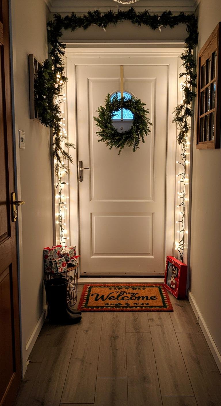 Your entryway is the first thing guests see, so why not make it count? Hang a cute small wreath on your door, lay down a fun Christmas-themed welcome mat, and add a few simple decorations like candles or greenery on tables or benches. You can even reuse leftover tree ornaments to decorate this space without extra spending.