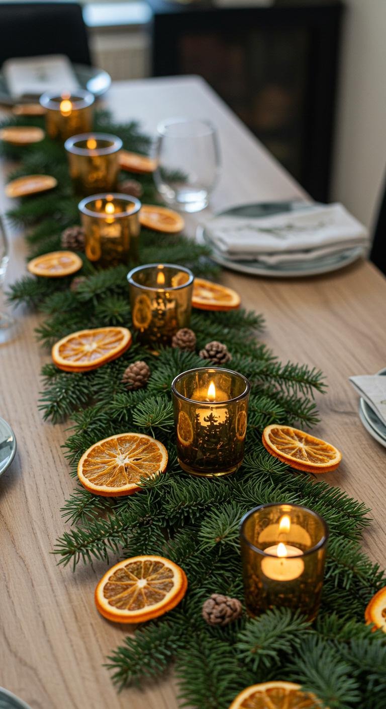 Forget the fancy store-bought runners—make your own with pine branches, eucalyptus, or burlap as the base. Throw in dried orange slices, cinnamon sticks, or berries for a beautiful look and amazing smell. The best part? You can hunt down these goodies in your garden or local craft shops, keeping things simple and affordable.