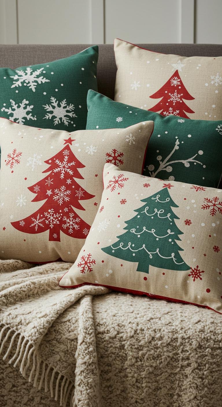 Swap out your regular throw pillows for holiday-themed ones with cute designs like snowflakes, Christmas trees, or reindeer. If you want to save some cash, just grab plain pillows and buy or make covers with festive fabric. It’s a quick, fun way to add holiday spirit to your living room or bedroom without a big investment.