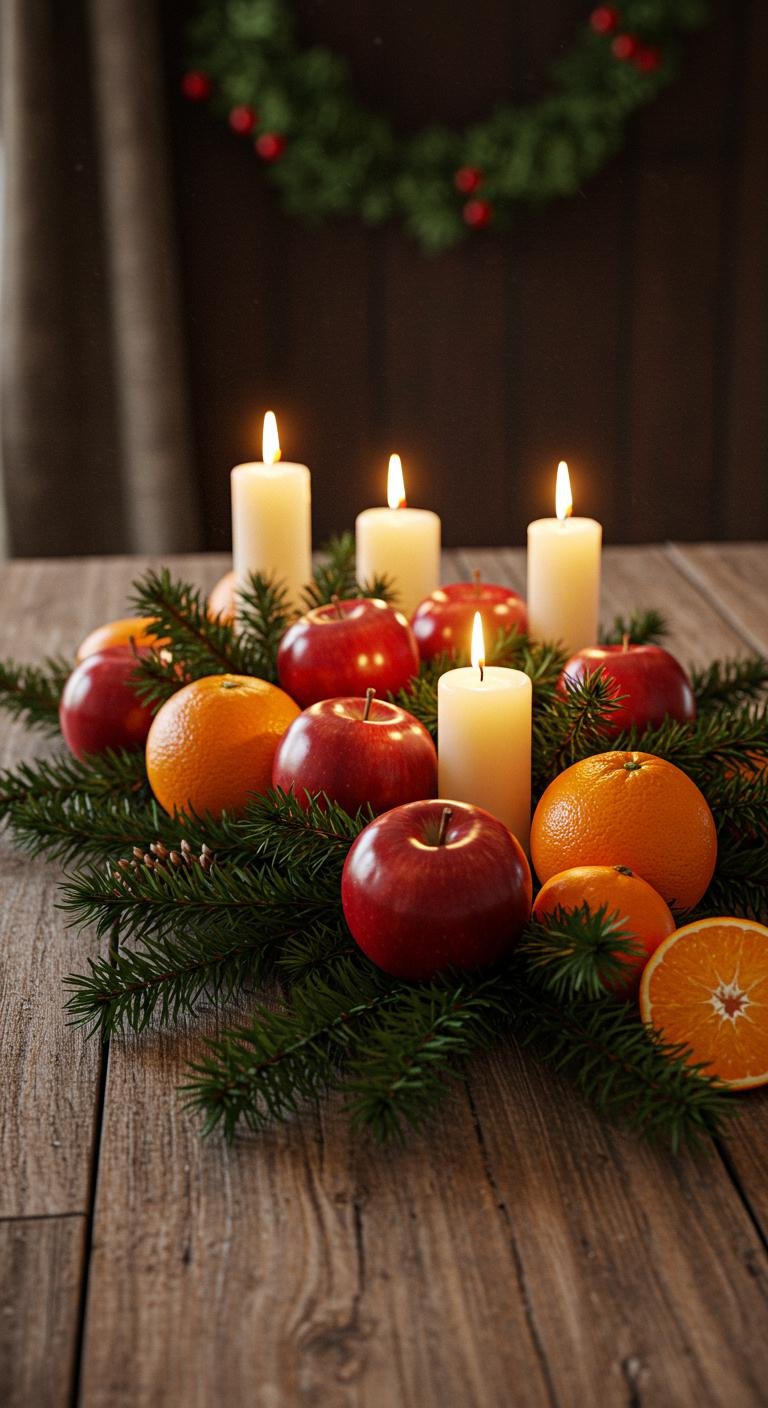 Turn fresh seasonal fruit into a centerpiece that looks gorgeous and tastes great too! Think oranges, apples, pomegranates mixed with pine branches arranged in a big bowl or a classic dough bowl. Tuck some candles in between for extra glow. It’s super inviting, smells wonderful, and bonus: you can totally eat the fruit later. Budget hack: buy fruit in bulk to save money and reduce waste.