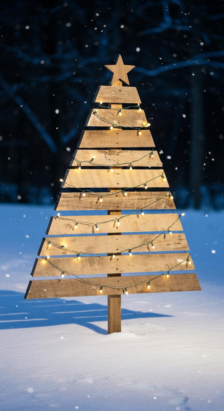 So, here’s a super cute and eco-friendly way to bring rustic charm outdoors: a pallet wood Christmas tree. Grab some old pallets (you might have some lying around or find them for free), cut them into triangles, and stack them up to form a tree shape. You can paint or stain the wood to amp up the natural vibe, then hang some lightweight ornaments or wrap it in string lights for that warm glow. Bonus points? This project often costs nada if you already have pallets on hand, and it’s a fun one to get the whole family involved in. Stuff like greenery, burlap, or even fabric scraps make great decorations that give it a cozy, homemade feel. Plus, you can reuse it year after year!