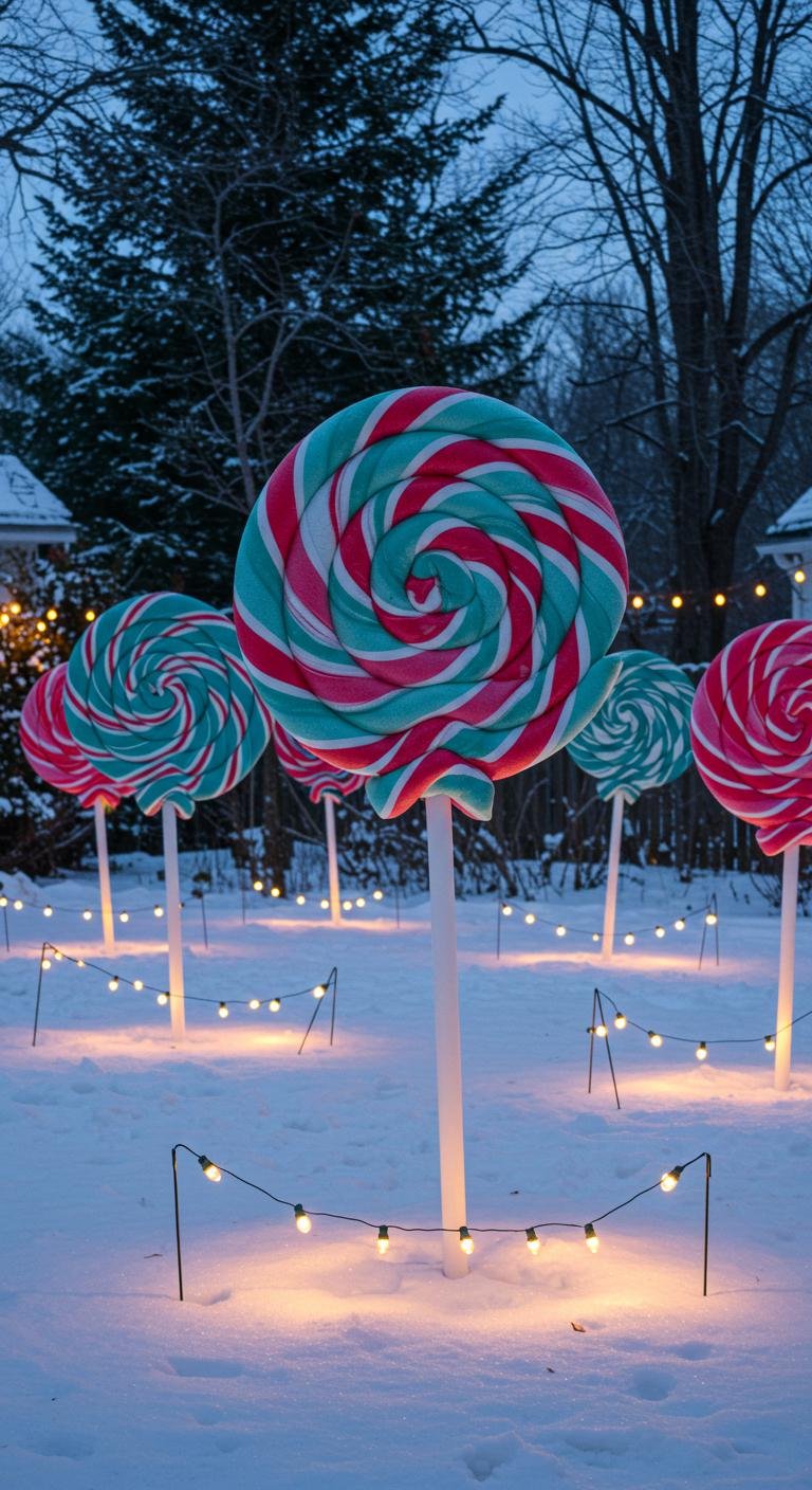 Here’s one that’s absolutely whimsical and just plain fun: pool noodle lollipops! Slice pool noodles into different lengths, then stick them onto a paper plate or cardboard circle using stakes for support. Paint them up in your favorite festive colors and patterns—swirls, stripes, polka dots, you name it. These make for bright and playful yard decor that’s surprisingly inexpensive, especially since pool noodles often go on sale for the holidays. Line them up along your garden path or tuck them in your flower beds for a cheerful pop of color and charm.