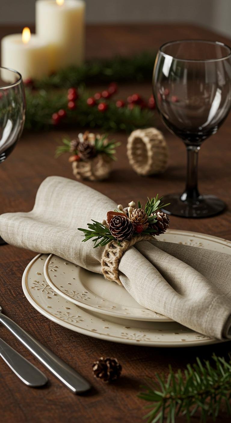 Napkin rings might seem small, but they pack a big style punch at any holiday meal. Use twine and deck them out with tiny pinecones or dried flowers for a rustic vibe. You can even add initials to personalize each one. They’re super easy to make and bring a charming, reusable touch to dining that your guests will appreciate every time they sit down.