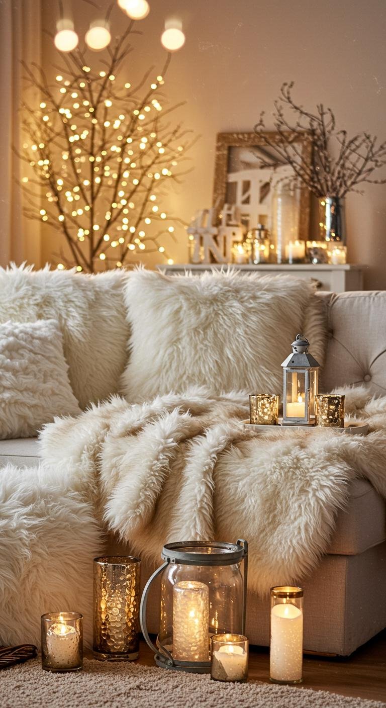 Nothing says cozy like faux fur during the holidays. Throws, cushions, or even rugs layered under the tree bring instant warmth. You can snag affordable versions locally or online, or go all-in and sew your own cushions from faux fur fabric (so fun and budget-friendly). Mix these textures with other textiles for a living room that’s basically begging for snuggles.
