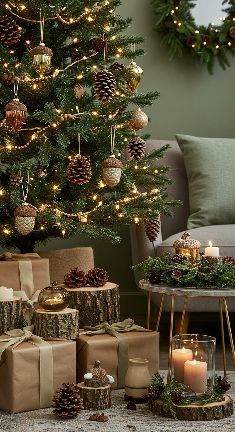 Bring a piece of the forest indoors with earthy ornaments like pinecones, berries, and twigs. You can totally DIY these by gathering stuff from your yard and jazzing them up with twine or hooks. Bonus: brew some potpourri with dried oranges, cinnamon sticks, and evergreen sprigs to fill your place with the kind of scents that scream Christmas magic.