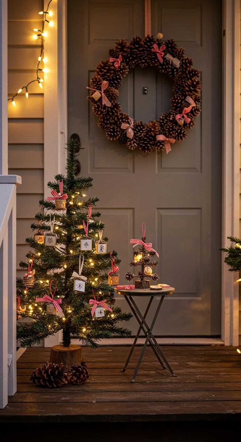There’s something so magical about garlands draped over railings or doorways — especially when you layer evergreen branches with soft fairy lights that twinkle in the dusk. You can totally DIY one using fabric or greenery, then toss in some dried fruits and pinecones for texture that pops. Not only does this bring the outdoors in, but it also wraps the whole porch in a snug, festive hug.