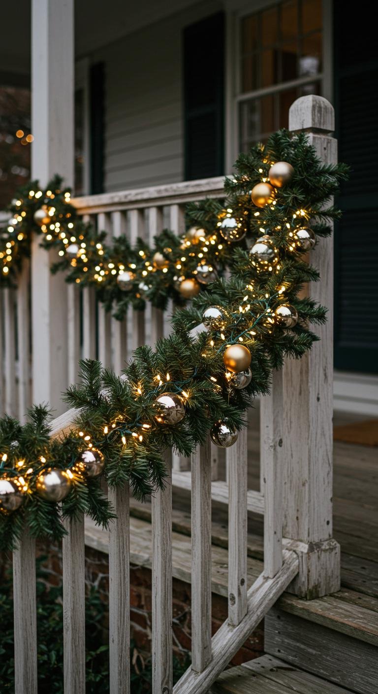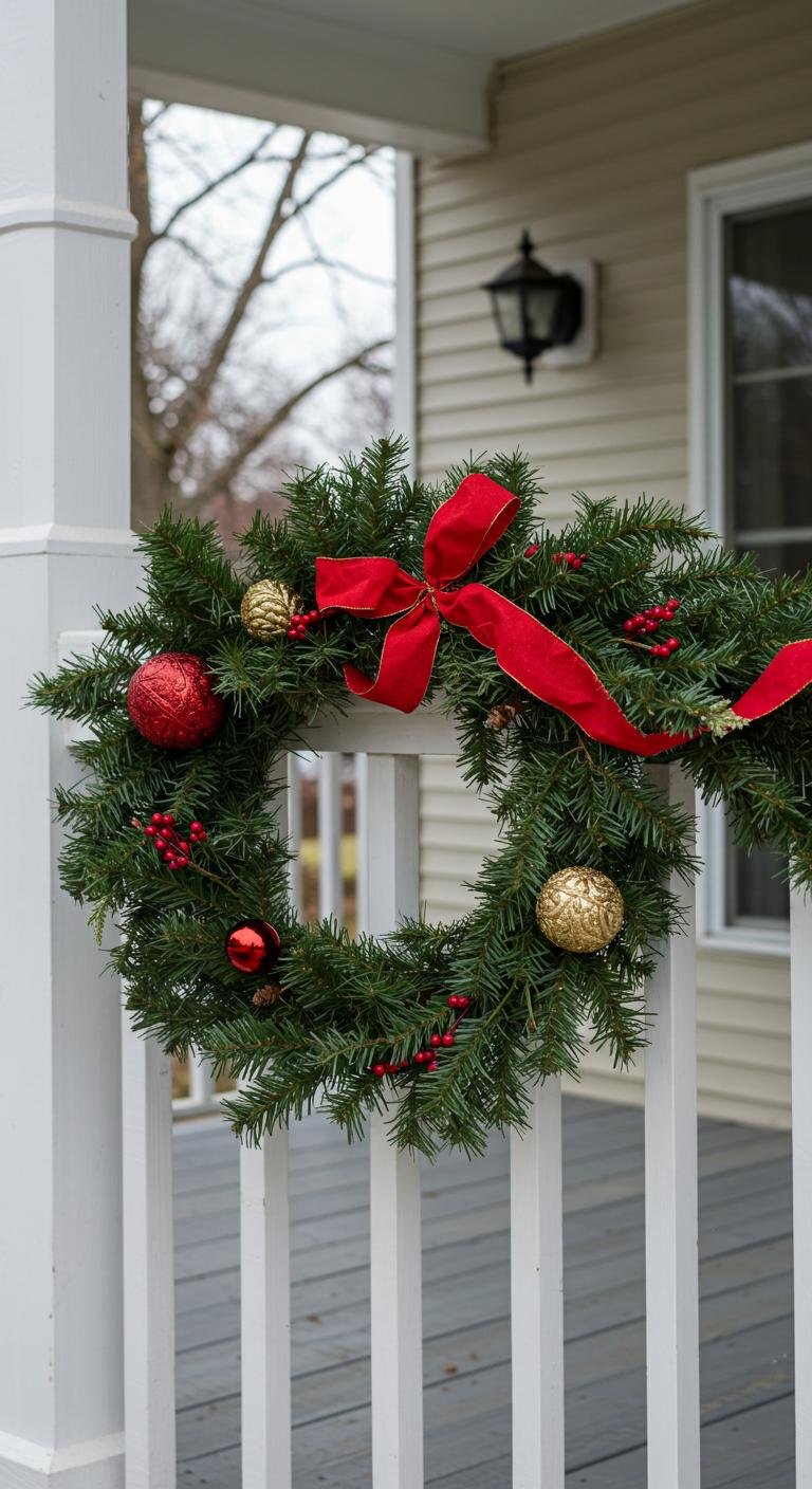 Don’t forget the railings—they’re like the unsung heroes of porch décor. Wrapping garlands snugly around them and topping off with ribbon bows adds an elegant, cohesive look that spreads the festive vibe across your entire porch. Secure everything with wire so it stays put through any winter breezes.