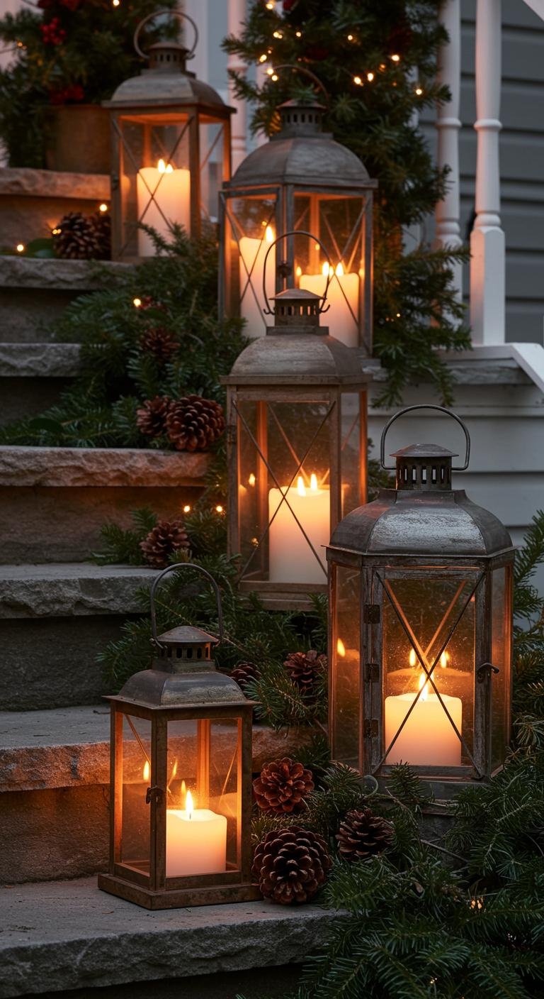 Lanterns give your porch that subtle glow that feels like a warm hug. Flameless candles inside keep things safe without losing the charm. Antique-style or classic black lanterns add a timeless touch — plus, you can pop them on steps or hang them for perfect ambiance. For a personal twist, fill your lanterns with things like seasonal greenery or sparkly ornaments; I love how affordable and effective this little trick is!