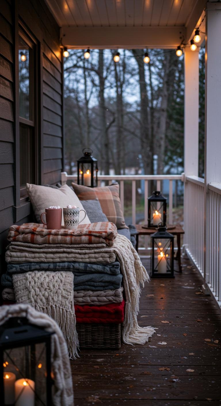 I love the idea of turning your porch into a little hangout spot with comfy seating dressed up in cushions and blankets. Mixing colors and textures adds warmth and personality. Memory foam cushions are an easy, budget-friendly DIY, and little side tables make room for snacks or drinks. Throw in some candles or even a portable heater, and you’re set for cozy holiday chats under the stars.