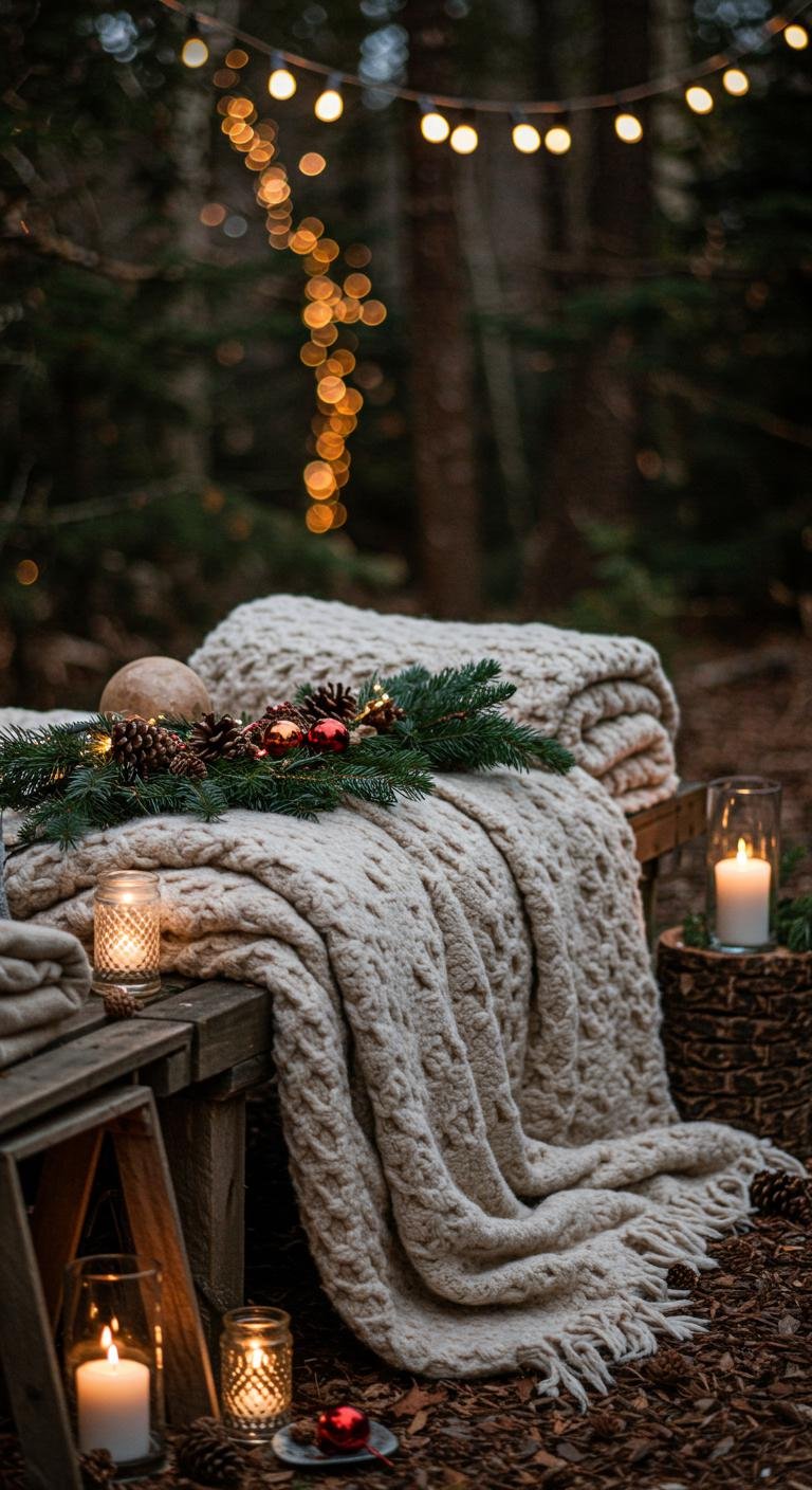 Throwing some textured, festive blankets over outdoor chairs or benches adds instant warmth and comfort, inviting everyone to hang out a bit longer. Look for cozy, affordable throws at thrift shops or clearance racks that match your holiday colors. Wrapping these around chairs or draping them over seating areas creates the perfect cozy nook to admire your decorations on chilly nights under the stars.