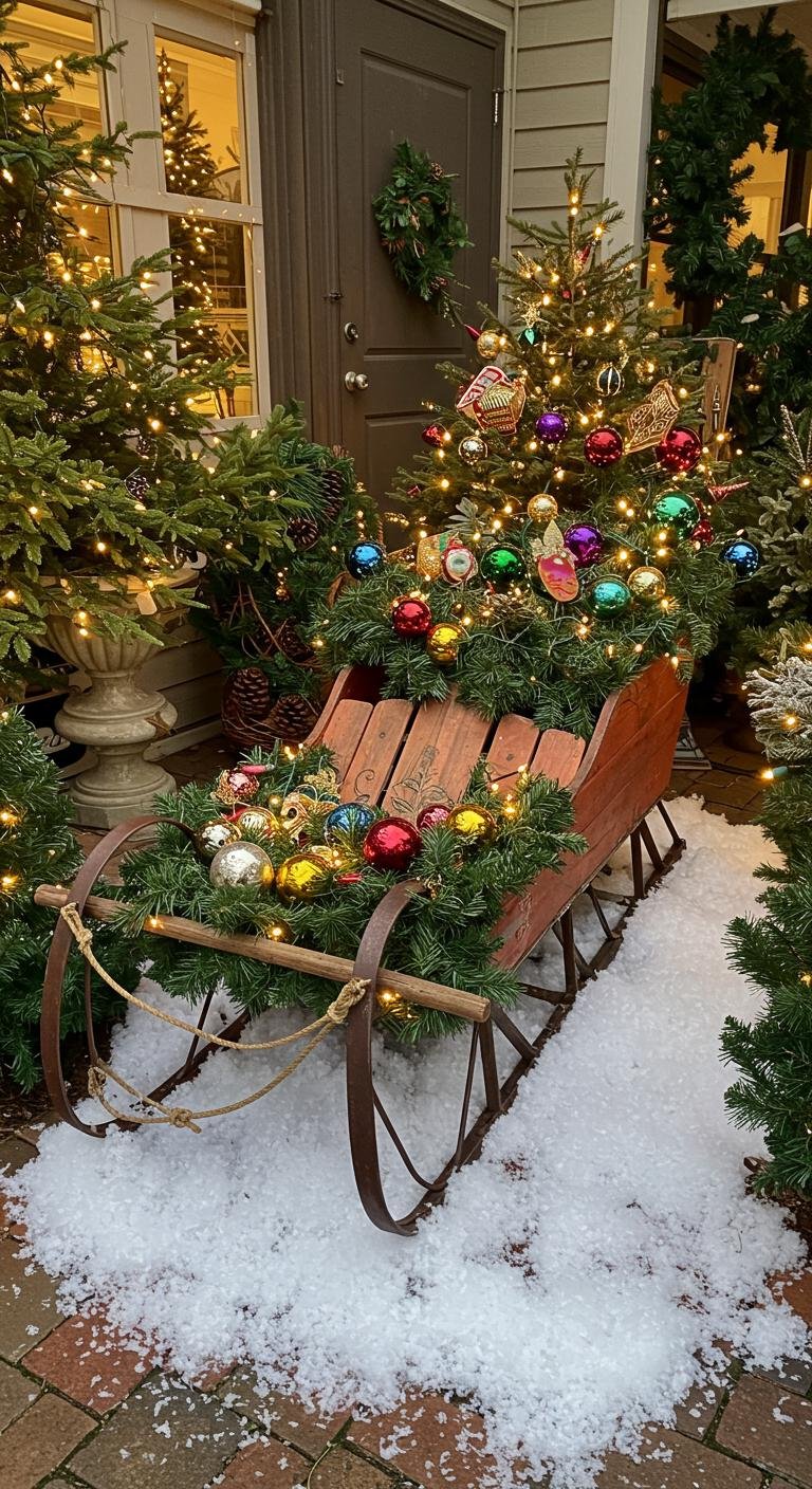 There’s something so inviting about vintage stuff during the holidays. Picture an antique sled decked out with fresh greenery—that’s instant nostalgia and a serious conversation starter. You can also pull out old skis or stack wooden crates filled with pine boughs as unique centerpieces. The best part? You can DIY by hunting thrift stores or garage sales for these gems, adding that rustic, warm vibe that makes your outdoor space feel extra welcoming.