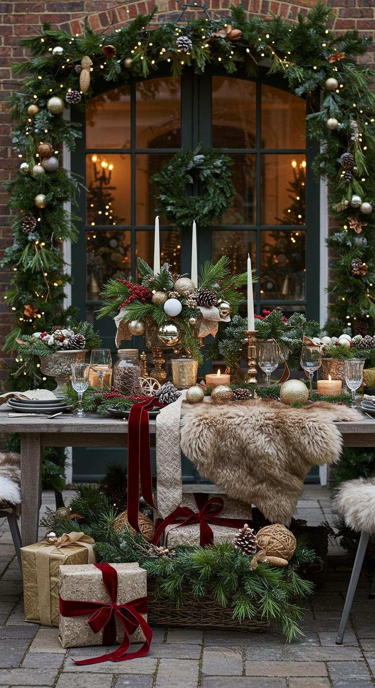 Texture is everything when you want your outdoor decor to feel warm and inviting. Try combining soft velvet ribbons, tiny pine branches, and shiny ornaments in wreaths or garlands. You can even wrap a vintage bench in a fluffy fur throw or toss textured cushions on outdoor chairs to bring in that cozy factor. These little layers add elegance without feeling stuffy, making your space perfect for holiday hangouts.