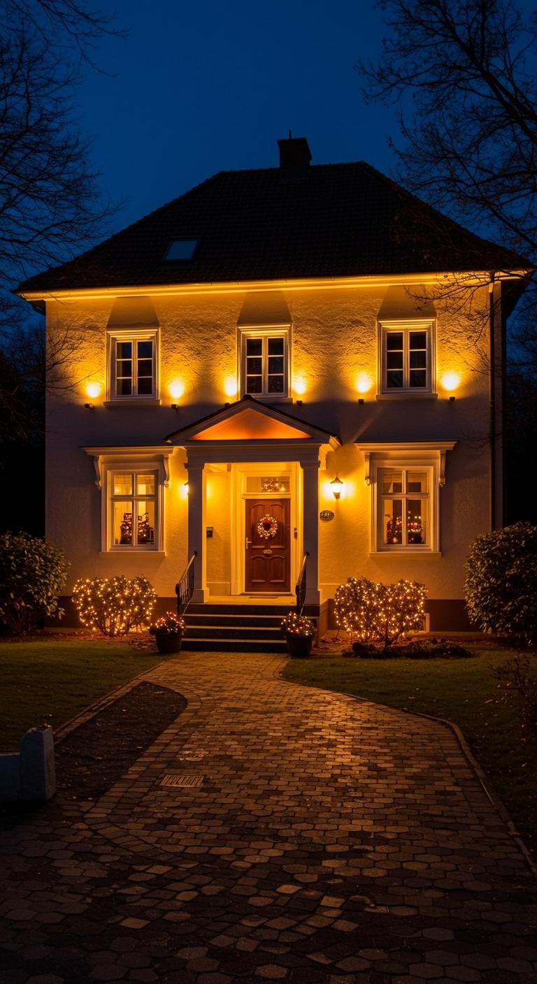 Architectural lighting isn’t just for indoors—it can make your home’s doorway or windows pop in the best way. Spotlights or battery-operated warm LEDs are easy to set up and add just the right glow. You can also wrap porch columns or outline windows with strings of soft lights to create a welcoming ambiance. Plus, lighting like this keeps things safe and bright when guests come over for holiday gatherings.