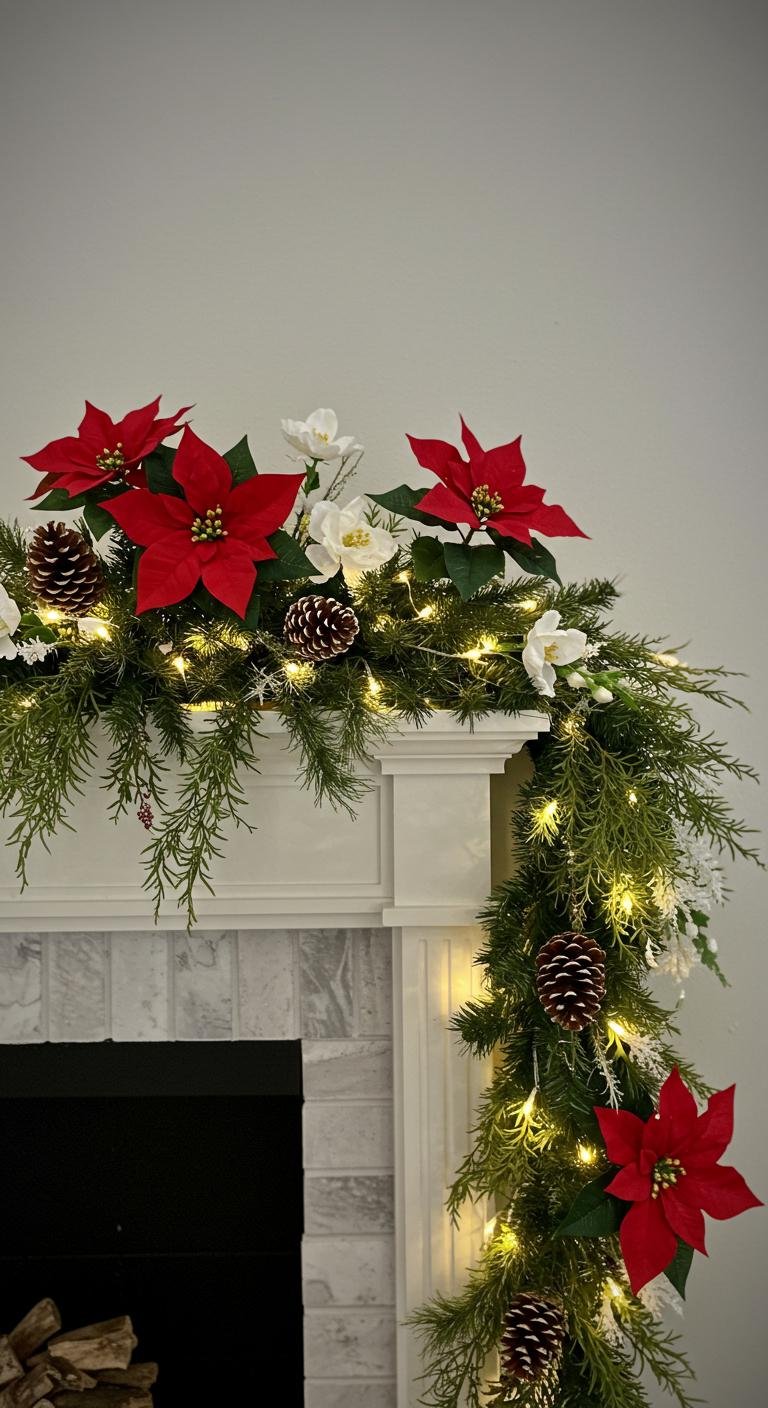 Embrace lush mantel greenery, interspersed with seasonal accents like vibrant poinsettias or delicate white flowers.
