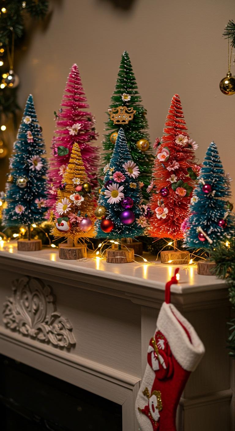 After you’ve transformed your mantel into a stunning display, consider adding a touch of whimsy with miniature floral fir trees.