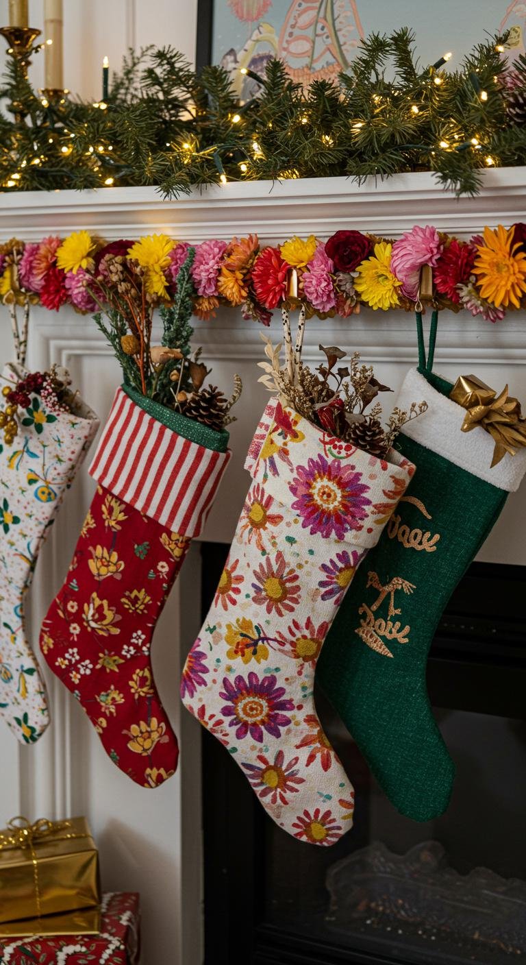 How can you elevate your holiday decor with a floral stockings hanger that captures the spirit of the season? Picture vibrant floral fabric cascading with playful patterns and textures, complementing your festive aesthetic. Add unique stocking embellishments like dried blooms or seasonal accents for that extra touch. This charming detail breathes life into your mantle, inviting warmth and beauty into your holiday celebrations.