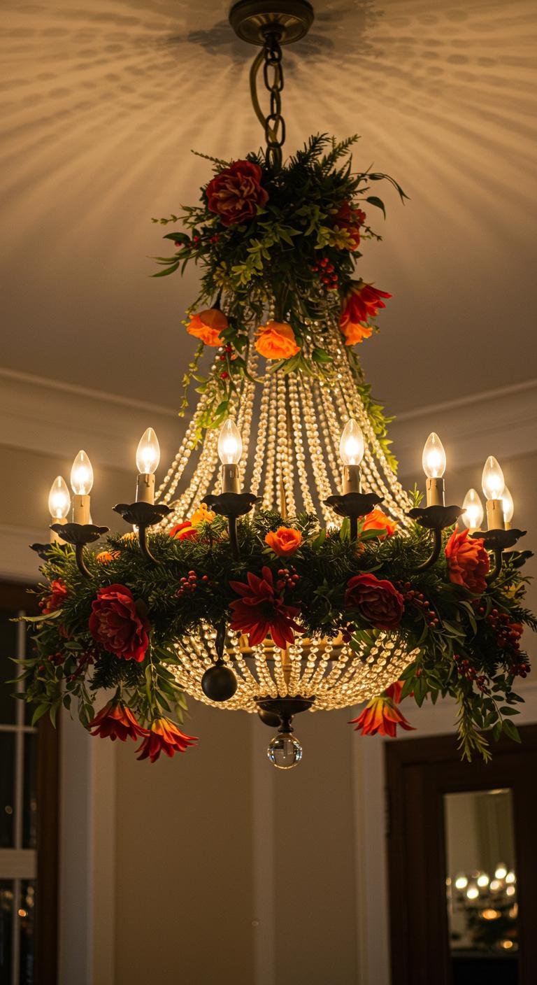 Elevate your holiday decor by incorporating floral chandelier accents that serve as stunning focal points in your space.