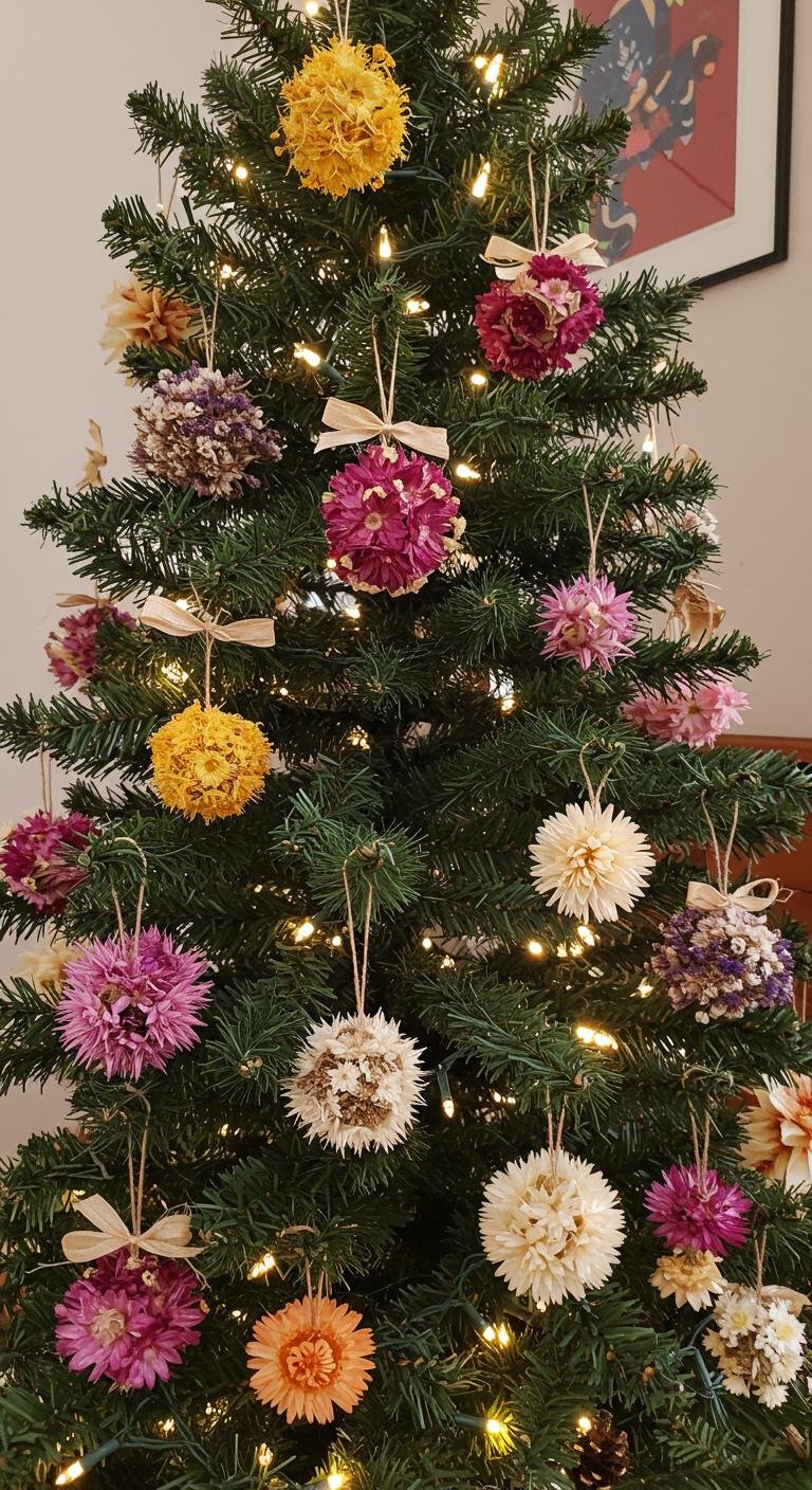Imagine the enchanting beauty of a Christmas tree adorned with ornaments crafted from delicate dried flowers.