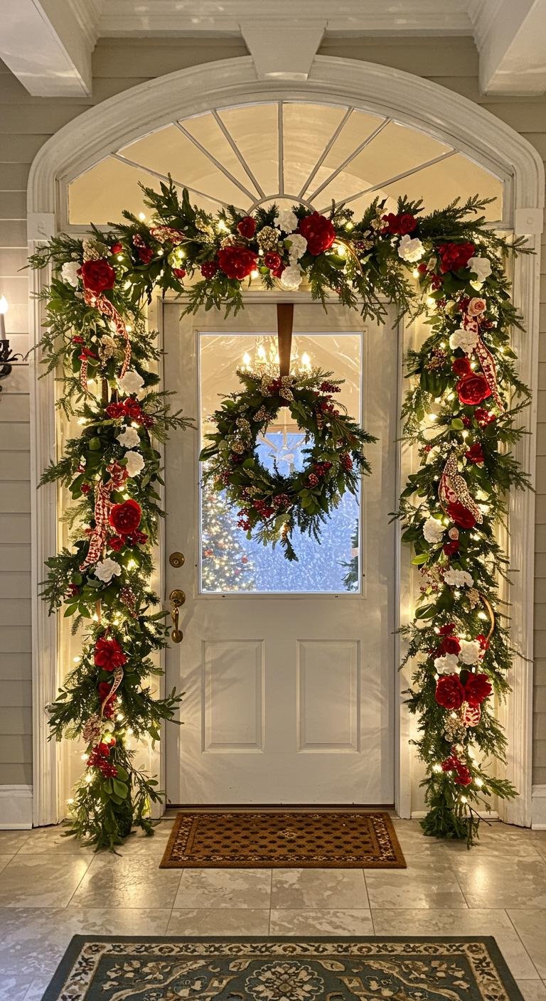 Drape lush, festive greenery across your entryway, intertwining vibrant blooms for a touch of elegance.